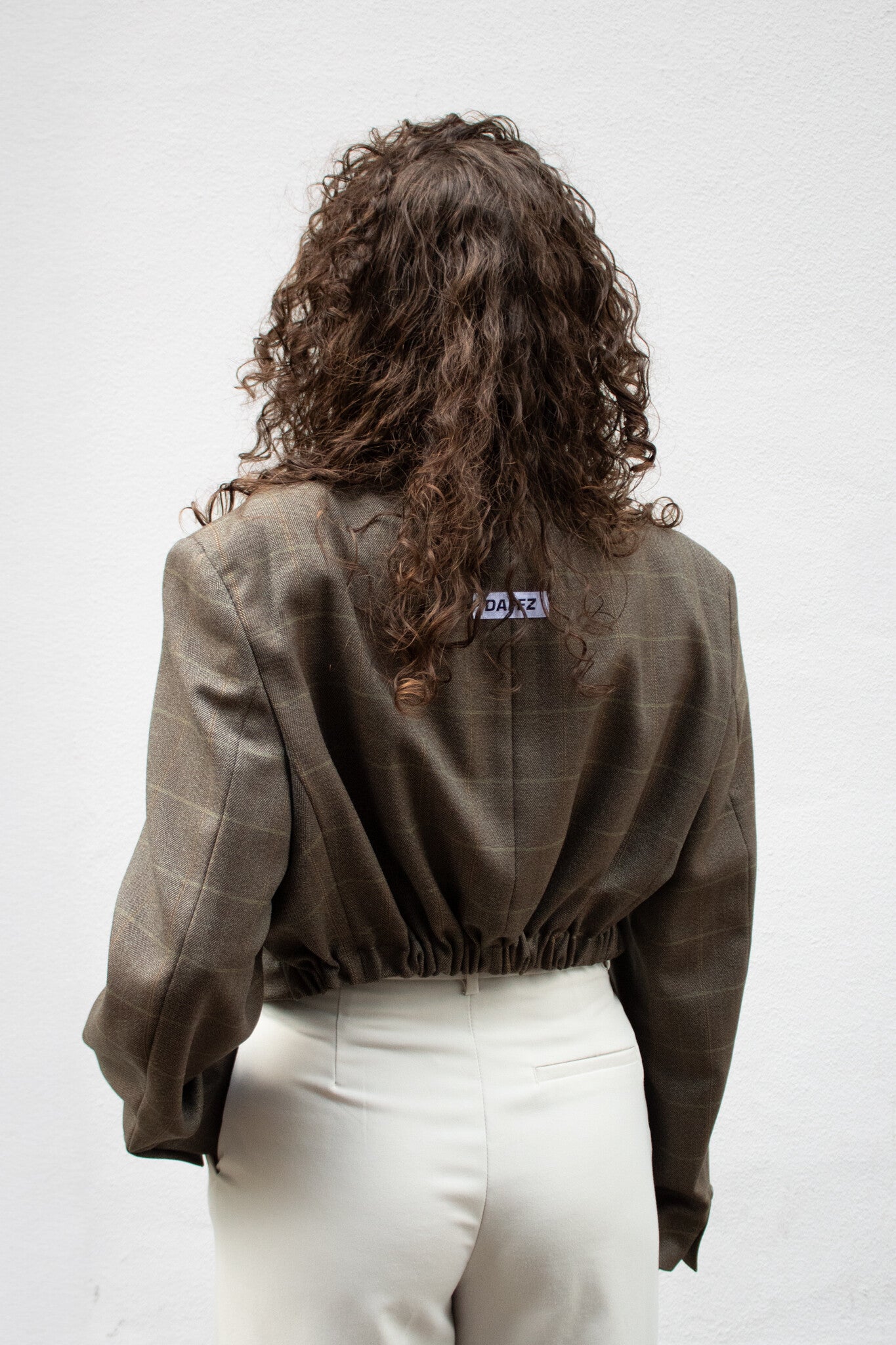 Deze cropped blazer komt in een groene kleur met ruitpatroon en heeft een getailleerde pasvorm die makkelijk te verstellen is.