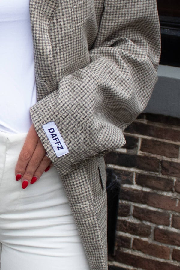 Deze cropped blazer komt in een beige kleur met ruitpatroon en heeft een getailleerde pasvorm die makkelijk te verstellen is.