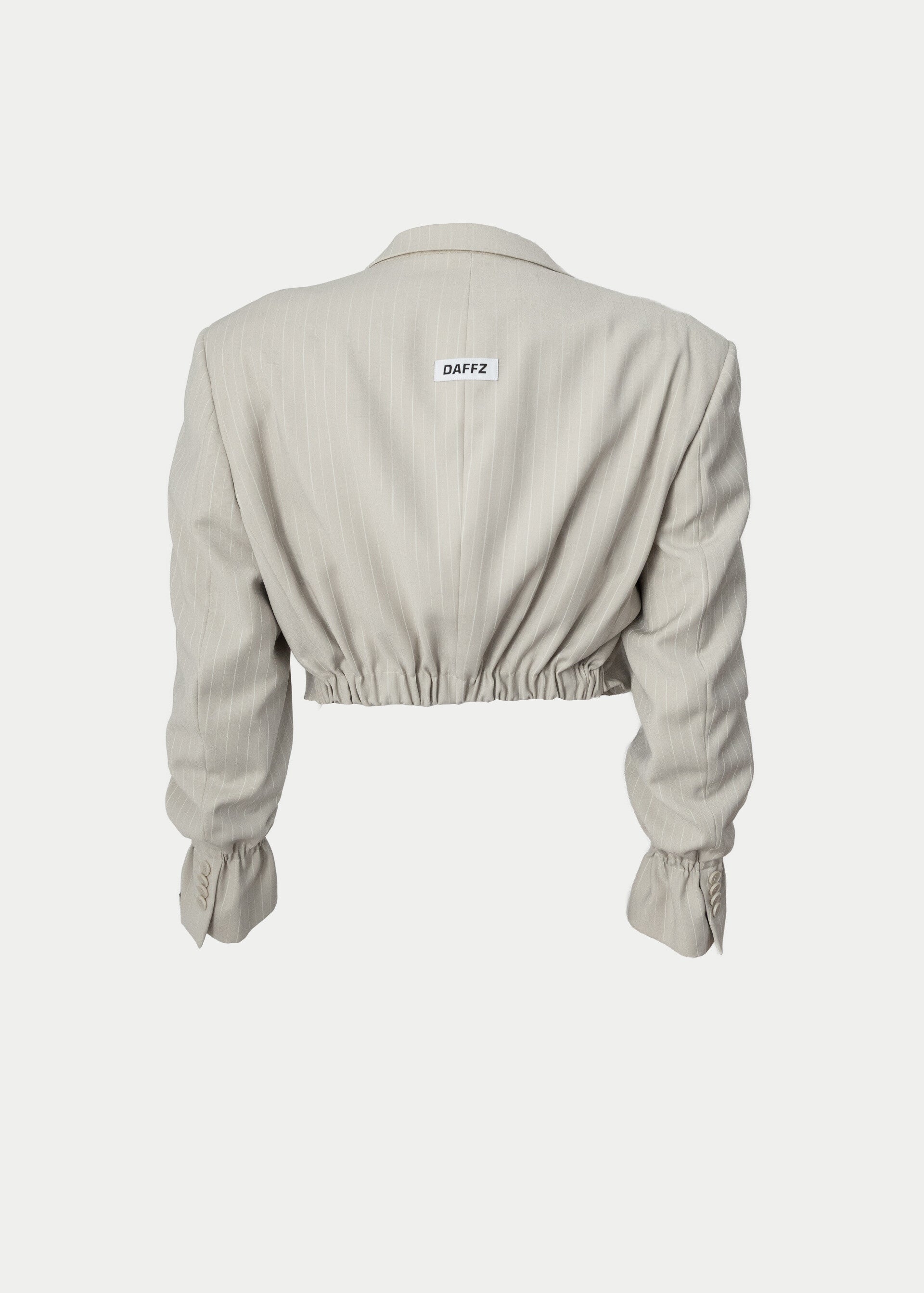 Deze cropped blazer komt in een beige kleur met streep en heeft een getailleerde pasvorm die makkelijk te verstellen is.