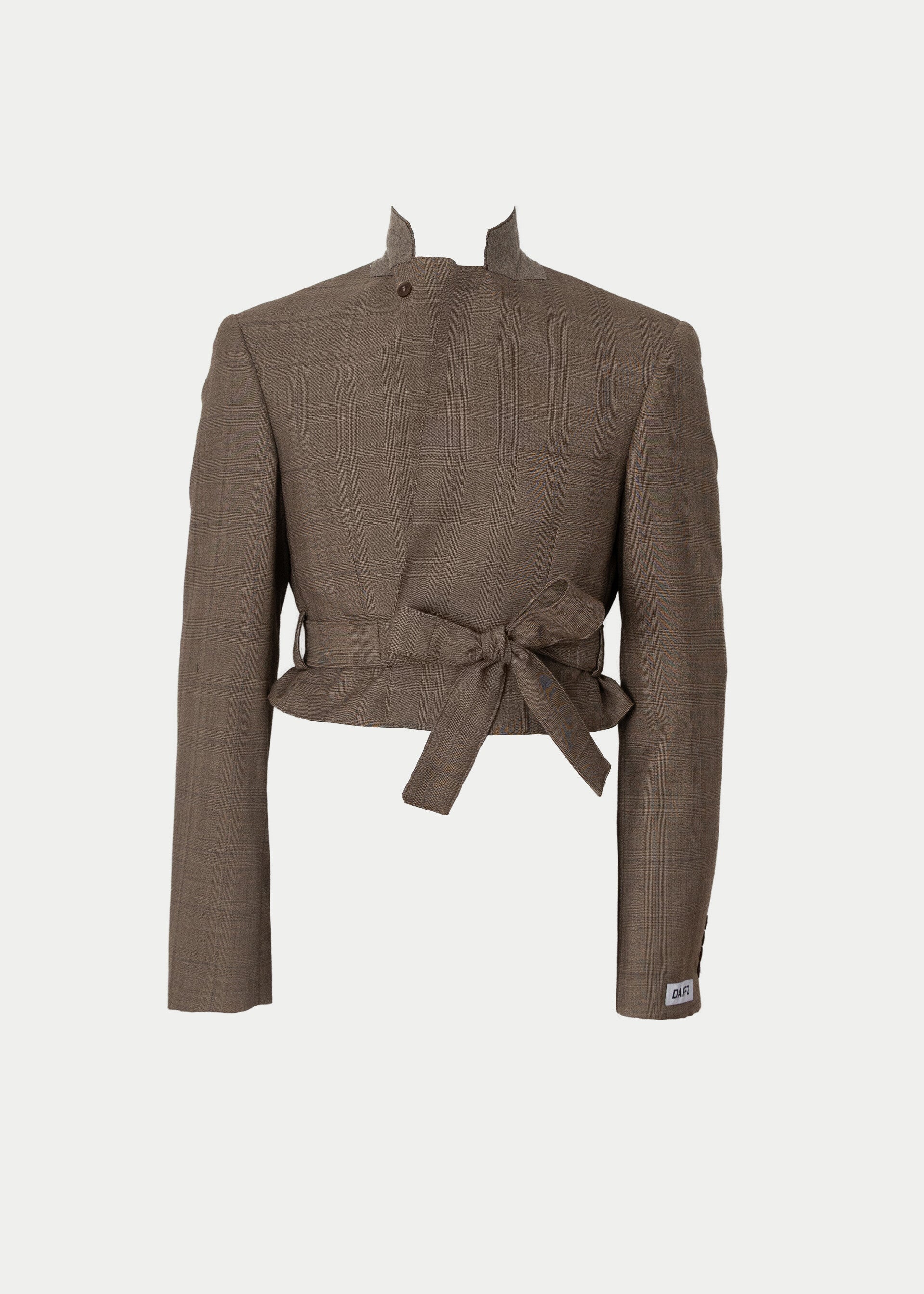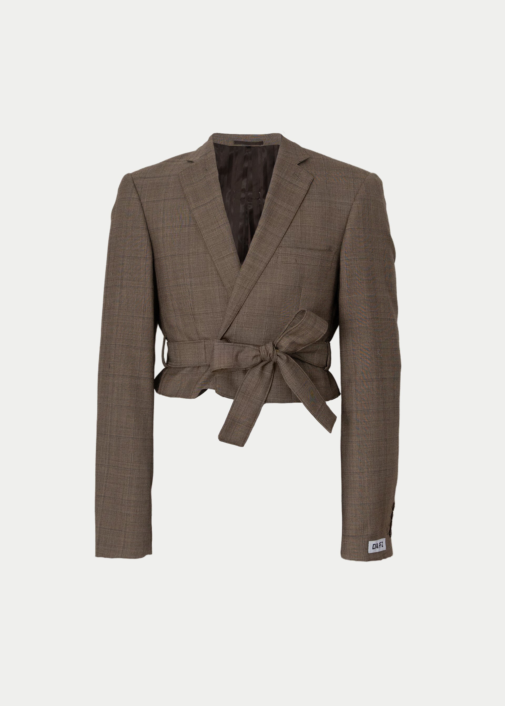 Deze cropped blazer komt in een bruine kleur en heeft een getailleerde pasvorm met een riem detail.