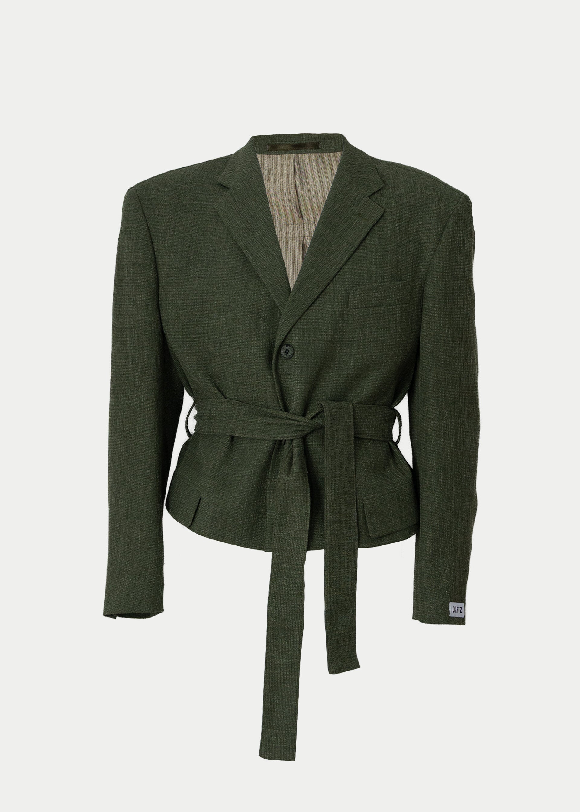 Deze cropped blazer komt in een groene kleur en heeft een getailleerde pasvorm met een riem detail.